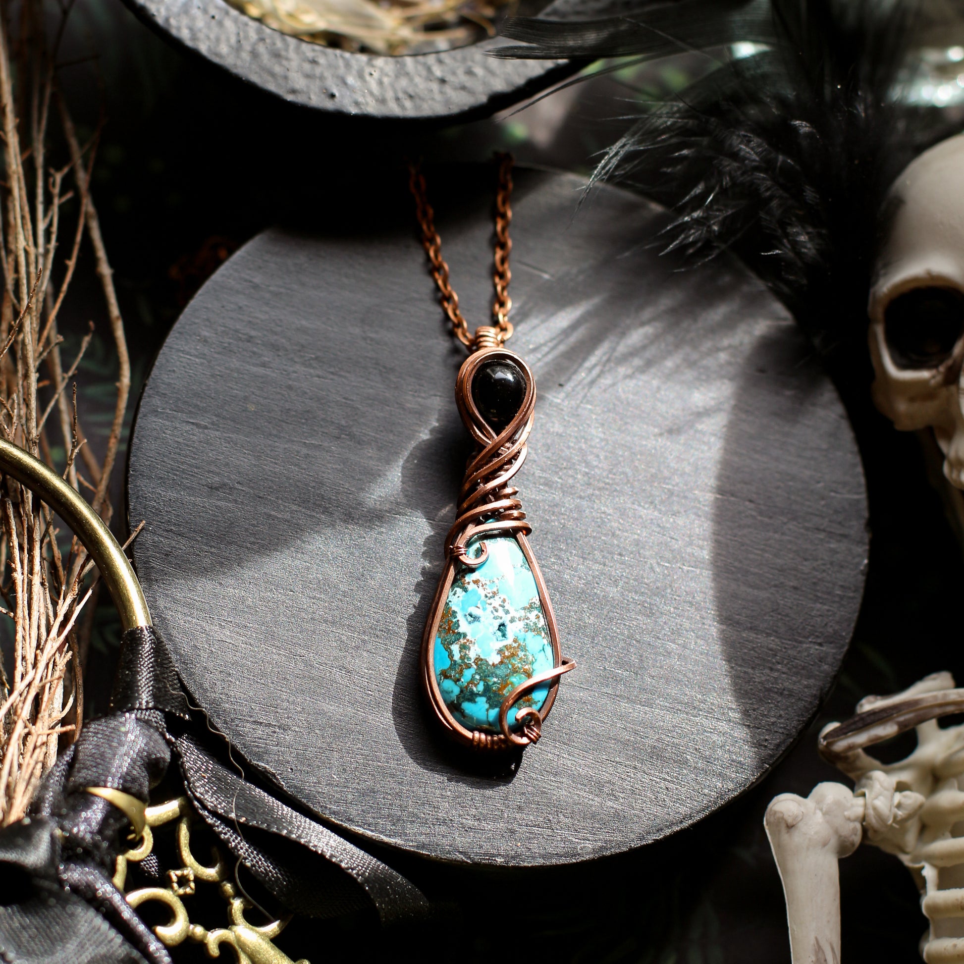 Magnesite Turquoise & Obsidian Necklace (Aged Copper)